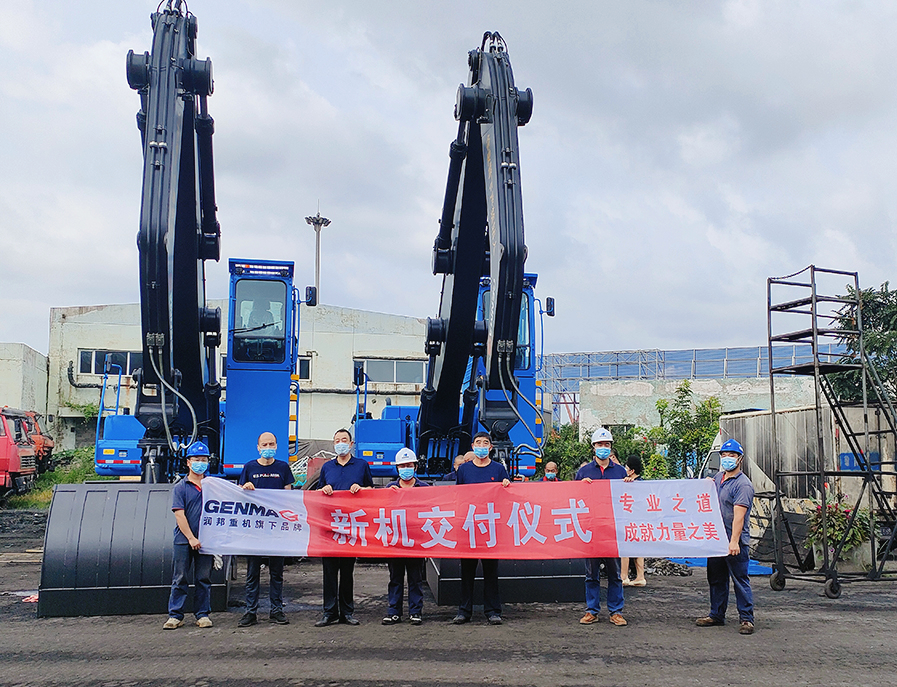 由潤邦重機自主研發制造的兩臺GENMA 42噸履帶式全液壓抓料機在河北唐山客戶現場正式交付。